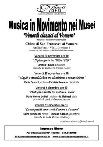 Il Presidente Mario Coppeto e l'Assessore alla cultura Gianpaolo de Rosa comunicano che, nello splendido scenario di incomparabile bellezza e ricchezza artistico-architettonica dell'Eremo del SS. Salvatore ai Camaldoli e della Chiesa di San Francesco di Via L. Giordano, si svolgeranno ben 6 concerti (dall'8 novembre all'11 dicembre) di musica classica e napoletana, eventi che caratterizzano da anni le iniziative culturali della Municipalità Arenella- Vomero.
