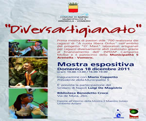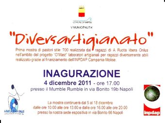 La V Municipalità inaugura il prossimo 4 dicembre alle ore 17.00, presso il Mumble Rumble,  la prima mostra di pastori stile '700 realizzata dai ragazzi dell'associazione A ruota libera onlus nell'ambito del progetto "O' Mast" - che prevede laboratori artigianali per ragazzi diversamente abili - realizzato grazie al finanziamento dell'INPDAP Campania-Molise.
