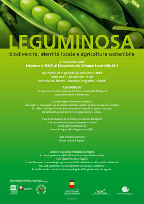 In occasione della "Settimana UNESCO per l'Educazione allo Sviluppo Sostenibile", il Comune di Napoli, in collaborazione con Slow Food Campania, promuove un percorso verso la riscoperta di sapori dimenticati e disimparati per avvicinare al consumo dei legumi e ad una nuova fruizione del territorio, riscoprire il valore delle sementi e il loro apporto nutrizionale ed ecologico. Sono diverse le iniziative messe in campo nell'arco della settimana che caratterizzano leguminosa". La mostra di legumi presso l'Antisala dei Baroni il 21 e 22 novembre; il mercato dei legumi presso Cantina La Barbera, Via Raffaele Morghen 36; i piatti a base di legumi che alcuni ristoratori hanno deciso di inserire nei propri menù per l'occasione. L'attuale regime alimentare moderno, sbilanciato su un maggior uso di proteine animali e segnato da ritmi di vita assai frenetici, ha orientato le scelte dei consumatori verso cibi di pronto consumo, che richiedono tempi più brevi di preparazione e cottura. Leguminosa vuole rappresentare un momento di riflessione volto ad insegnare ad un consumo più consapevole a far conoscere i prodotti delle terre campane. |
