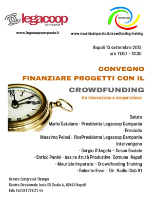 Che fare? Comprendere, confrontarsi, analizzare! Il convegno organizzato e promosso da Legacoop Campania e Master Mind srl, si svolgerà venerdì 13 settembre dalle ore 11.00 alle ore 13.00. Una mattinata di intenso confronto per comprendere cosa sia il finanziamento dal basso attraverso il Crowdfunding, verificare le esigenze del mondo della cooperazione con le testimonianze di illustri cooperatori, di rappresentanti istituzionali, giornalisti e consulenti.