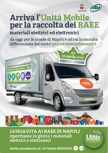 E' partito lo scorso 13 aprile il progetto sperimentale di raccolta itinerante dei RAEE (rifiuti elettronici) organizzato dal Comune e ASIA nei quartieri del centro storico di Napoli e destinato ad incrementare e favorire la raccolta sul territorio dei piccoli elettrodomestici, Tv, Monitor e Sorgenti luminose. Il servizio di raccolta dei RAEE sarà attivo dal lunedì al sabato, dalle ore 09:00 alle ore 13:00. Consulta la pagina per controllare il calendario del servizio di raccolta. |