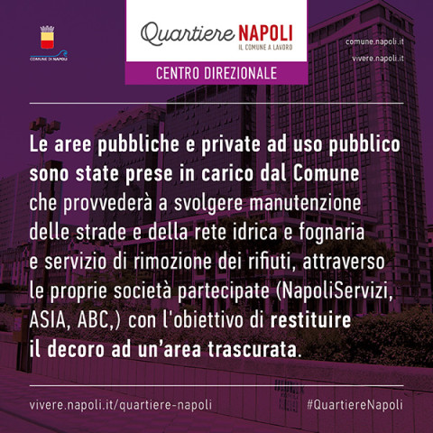 - Le aree pubbliche e private ad uso pubblico sono state prese in carico dal Comune che provvederà a svolgere manutenzione delle strade e della rete idrica e fognaria e servizio di rimozione dei rifiuti, attraverso le proprie società partecipate (NapoliServizi, ASIA, ABC,) con l'obiettivo di restituire il decoro ad un'area trascurata.