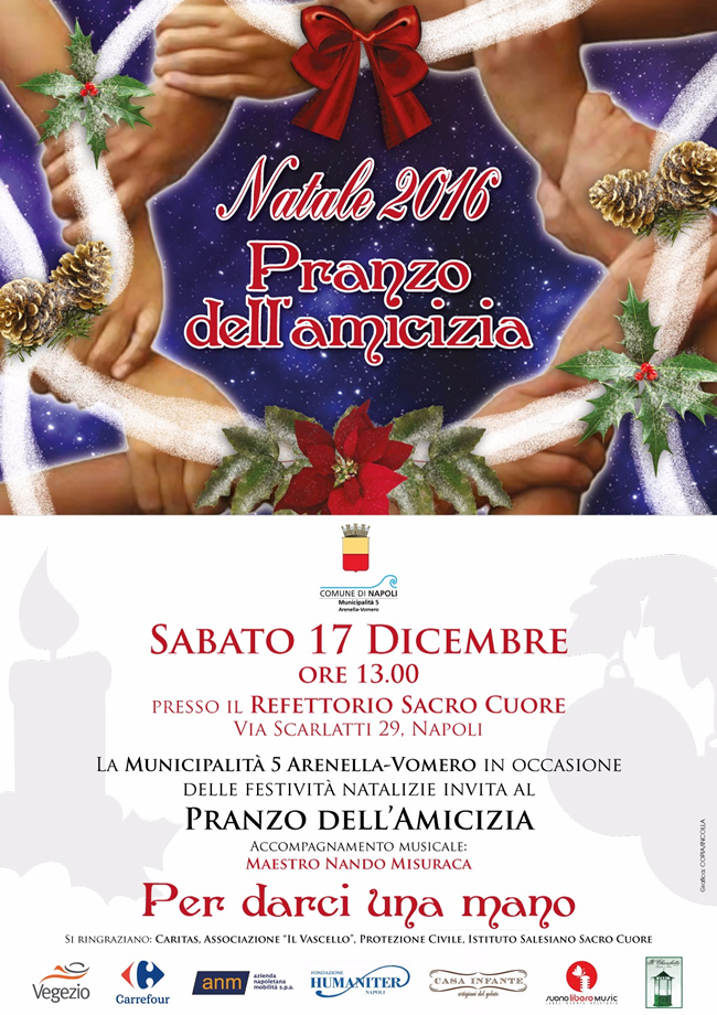 In occasione delle festività Natalizie, come di conseto, questa Municipalità ha organizzato un Pranzo dell'Amicizia che ospiterà 150  cittadini, tra i più bisognosi, sabato 17 dicembre 2016 alle ore 13.00  nel Refettorio dell'Istituto Salesiani in Via Scarlatti.