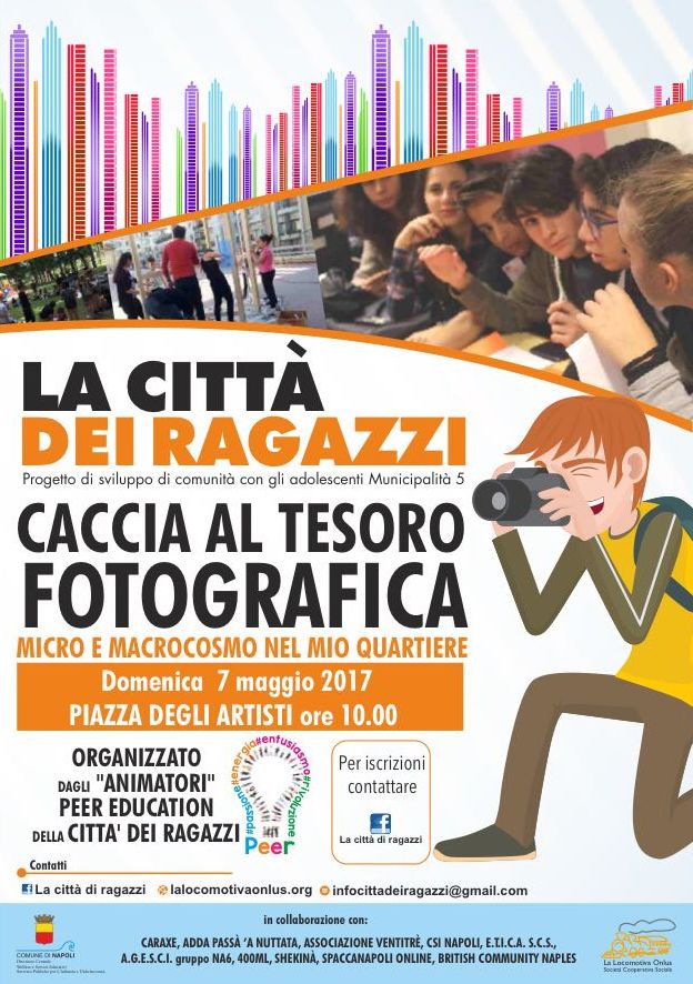 Conosci il tuo quartiere? Dimostracelo! Fallo con una foto partecipando al nostro evento. Domenica 7 maggio vi aspettiamo a Piazza Degli Artisti (lato Lord Tonino) alle ore 10,00 per partecipare alla caccia fotografica organizzata dagli animatori "peer educator" della Città dei Ragazzi. Per iscrizioni inviare un messaggio privato su Fb ad @Alessia Galluccio specificando nome, cognome, età, numero di telefono.