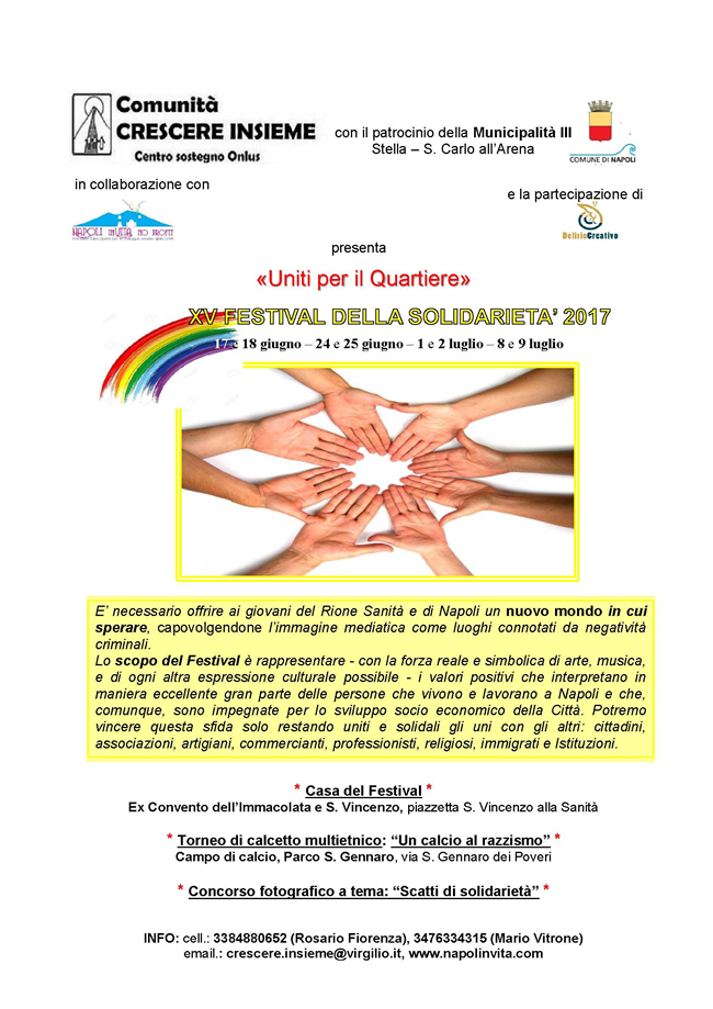 La Municipalità 3 patrocinia l'evento " XV Festival della Solidarietà 2017" che si terrà nei giorni: 24- 25 giugno, 1 - 2 luglio e 8-9 luglio 2017.