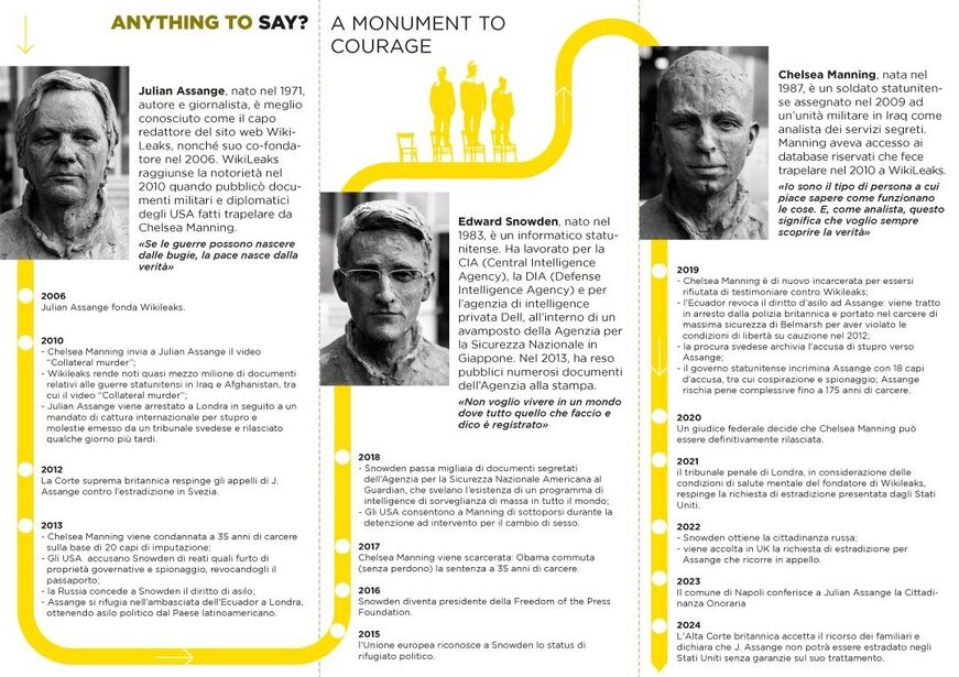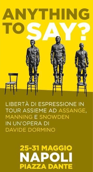 “Anything to say?” é una scultura in bronzo, a grandezza naturale, che raffigura tre figure in piedi su tre sedie e una quarta sedia vuota. La quarta sedia é per noi, per chi deve dire qualcosa o per chi si vuole semplicemente mettersi al fianco delle tre figure che rappresentano il coraggio di voler sapere e di rifiutare di essere controllati: sono Edward Snowden, Julian Assange e Chelsea Manning. Sono stati scelti come esempio di rivoluzionari contemporanei, eroi controversi, soggetti amati e odiati ma comunque capaci di scardinare le regole di un sistema di controllo che gestisce tutte le nostre vite. Davide Dormino ha colto l’idea di Charles Glass, un giornalista impegnato nelle vicende di politica internazionale, e l'ha interpretata artisticamente. La quarta sedia ci permette di alzarci per vedere meglio, per cambiare il nostro punto di vista, per esprimerci. E’ il primo esempio di scultura itinerante e interattiva: pur avendo tutta la tradizionale forza del monumento pubblico, si muove e vuole che la gente si muova. Viaggia per il mondo, si sposta per far capire alle persone che devono spostarsi per vedere meglio, salendo su una sedia, anche a rischio di cadere. Si muove perché é il monumento di tutti, non di un credo politico o religioso, non di un paese solo: il coraggio di uomini come Assange é per tutti. La dimensione mondiale del problema fa si che ognuno di noi sia coinvolto e che si senta “difeso” dal coraggio di chi svela il sistema con cui vengono indirizzate le nostre scelte oltre che motivare guerre inutili. E’ stata realizzata nella Antica Fonderia Mariani di Pietrasanta, un luogo dov’é ancora viva e operativa la cultura artistica e artigianale italiana. L’opera sarà installata a Napoli grazie alla collaborazione tra l’artista e gli attivisti napoletani che si battono per la libertà di Julian Assange, giornalista australiano, detenuto in un carcere inglese di massima sicurezza in attesa di sentenza di estradizione negli USA, dove lo aspetta una detenzione fino a 175 anni per aver pubblicato sul sito Wikileaks, tra l’altro, prove di crimini di guerra commessi dagli USA nelle guerre in Iraq e Afghanistan. Con una cerimonia al Maschio Angioino il 10 novembre 2023 il sindaco di Napoli Gaetano Manfredi ha conferito la cittadinanza onoraria a Julian Assange. La pergamena e la medaglia della città sono state consegnate a Stella Moris, moglie di Assange.