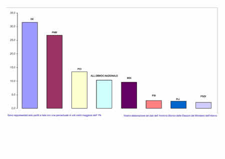 No al sistema maggioritario. La DC con la nuova legge elettorale punta alla maggioranza assoluta dei voti (50%+1) per aggiudicarsi il premio di maggioranza. Invece perde in modo netto, -8,3 punti percentuali al Senato e -8,4 alla Camera. A Napoli la flessione dello Scudo Crociato alle elezioni per il rinnovo dei rappresentanti a Palazzo Madama è ancora maggiore (-13,7%), nel Capoluogo campano sono i monarchici a realizzare un forte incremento (+12,8%).